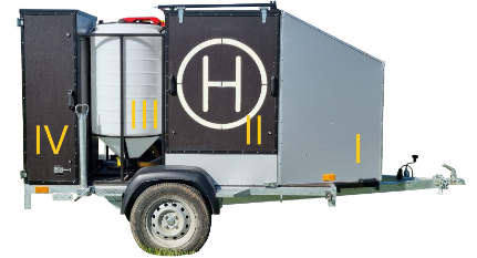 The BeeAgro UNO Trailer is a standardized equipment set mounted on a wheeled car trailer platform, designed for plant protection, crop spraying, and similar tasks. Its thoughtful design enables efficient use of the agri-drone and ensures autonomy during field operations.